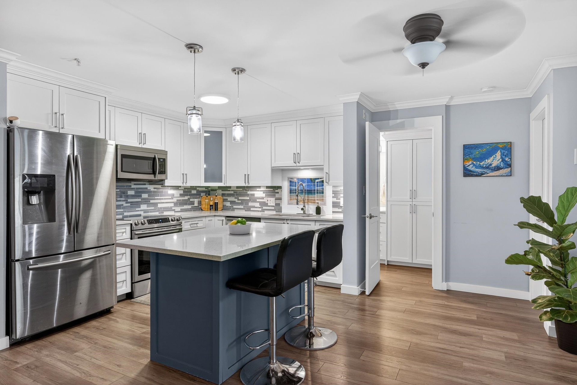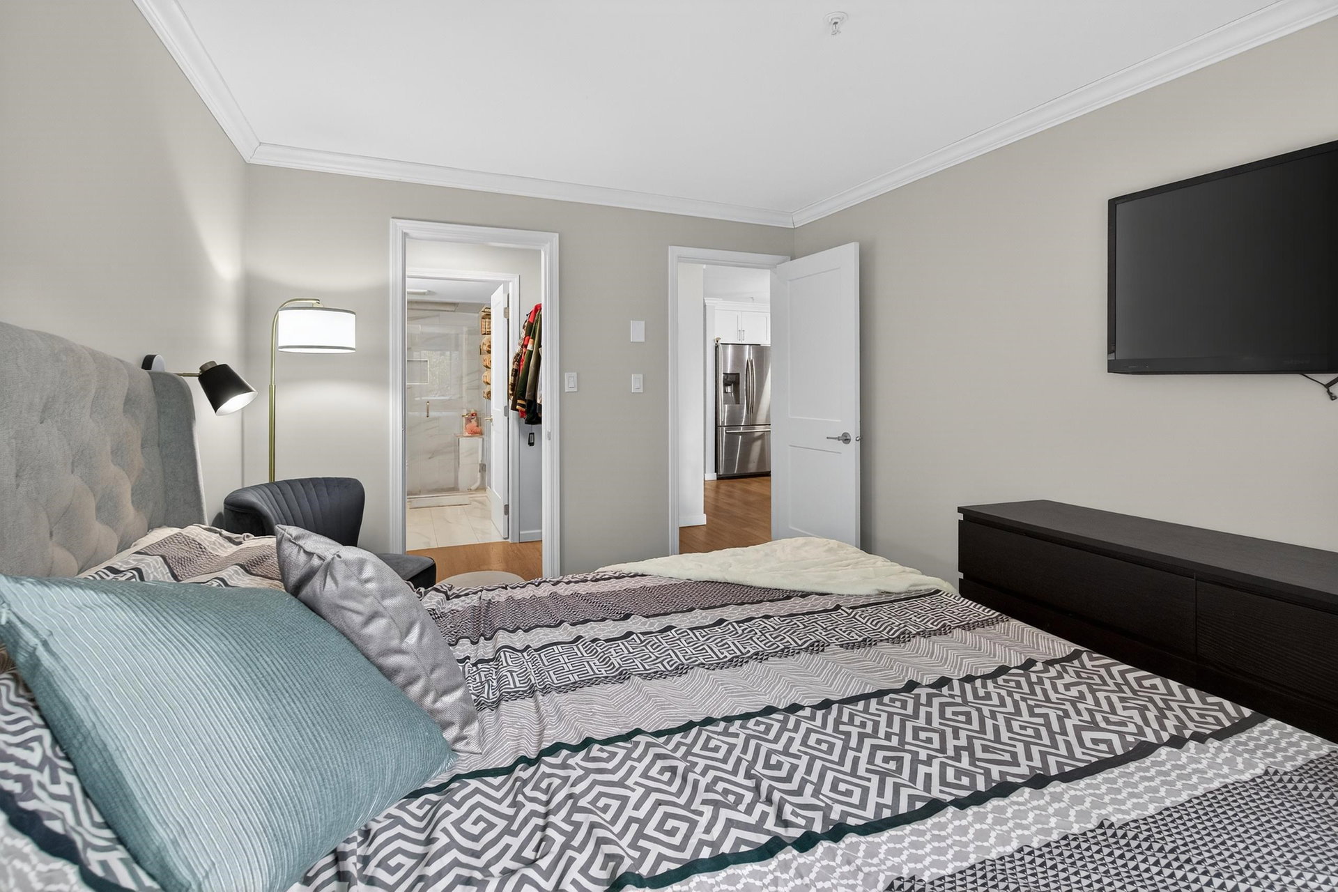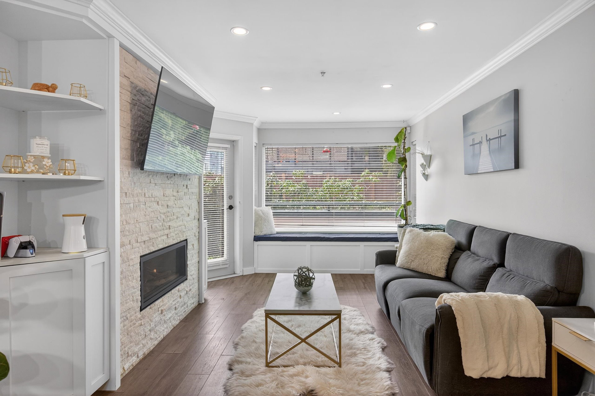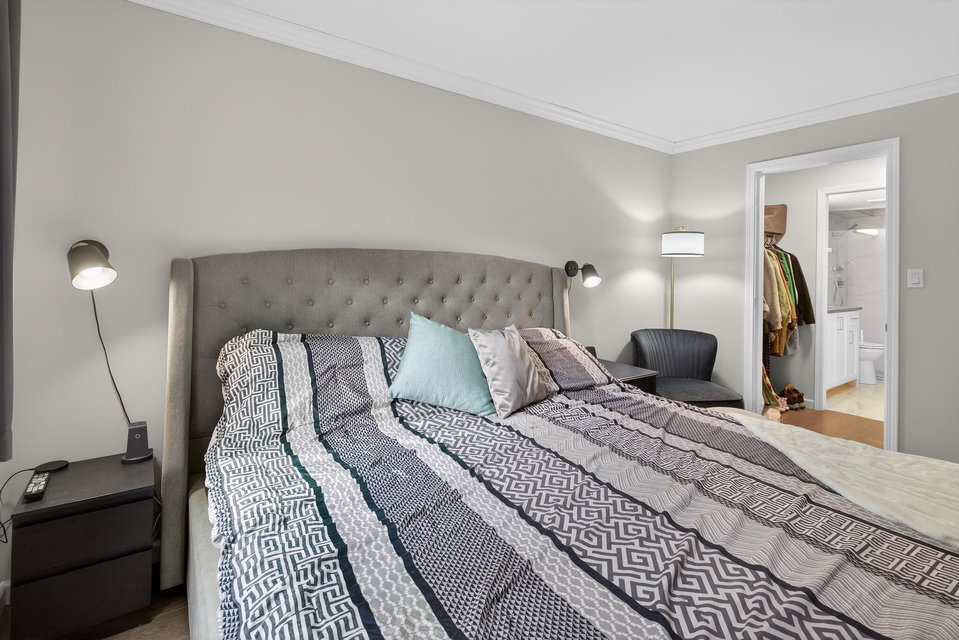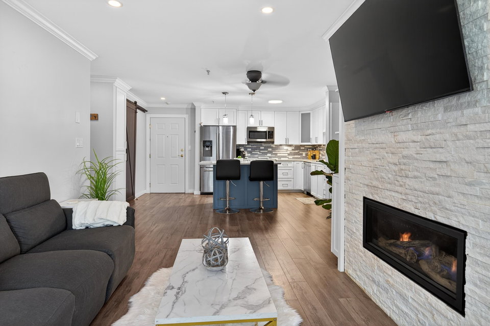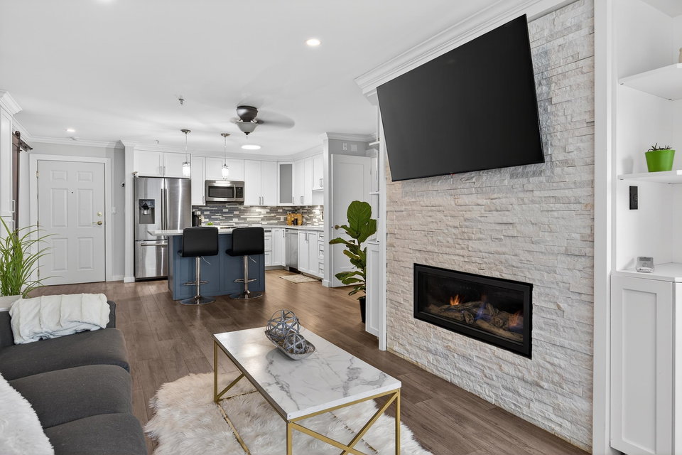 OPPORTUNITY AWAITS! This TWO bedroom TWO bathroom updated condo is move in ready. Just a short walk to the University of the Fraser Valley and close to Abbotsford Centre, public transit, shopping and dining. Updated white kitchen with quartz counters, large island and stainless appliances. The living room with LINEAR GAS FIREPLACE opens to a large sundeck flanked by beautiful rhodos. The primary bedroom includes a walk-through closet and 4 pc ensuite. Enjoy the convenience of an in-suite laundry room with storage. 2 PETS WITH NO SIZE RESTRICTIONS. The building offers great amenities—fitness room, guest suite, and a social lounge. An incredible opportunity for singles, couples or two friends. OPEN SAT MAR 7 2-4